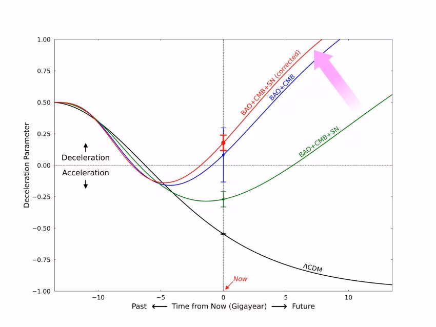 გამოსწორებული სუპერნოვას მონაცემები და მხოლოდ BAO+CMB შედეგები ორივე მიუთითებს იმაზე, რომ ბნელი ენერგია სუსტდება და მნიშვნელოვნად ვითარდება დროთა განმავლობაში.